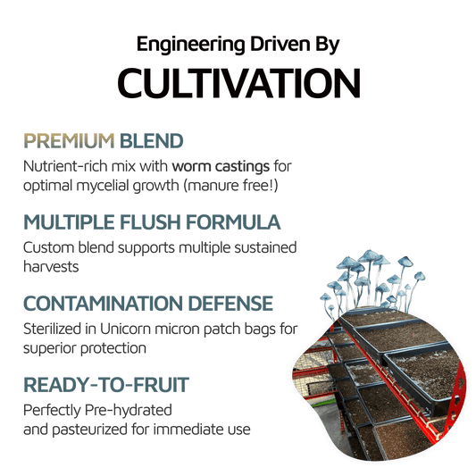 Incorporates nutrient-dense worm castings, boosting substrate fertility and enhancing mycelial growth.